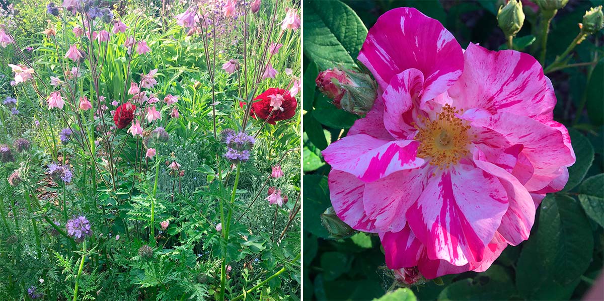 Akeleien, Phacelia (Büschelschön) und Wildrose Gallica Versicolor als sorgsame Bienenweide.
