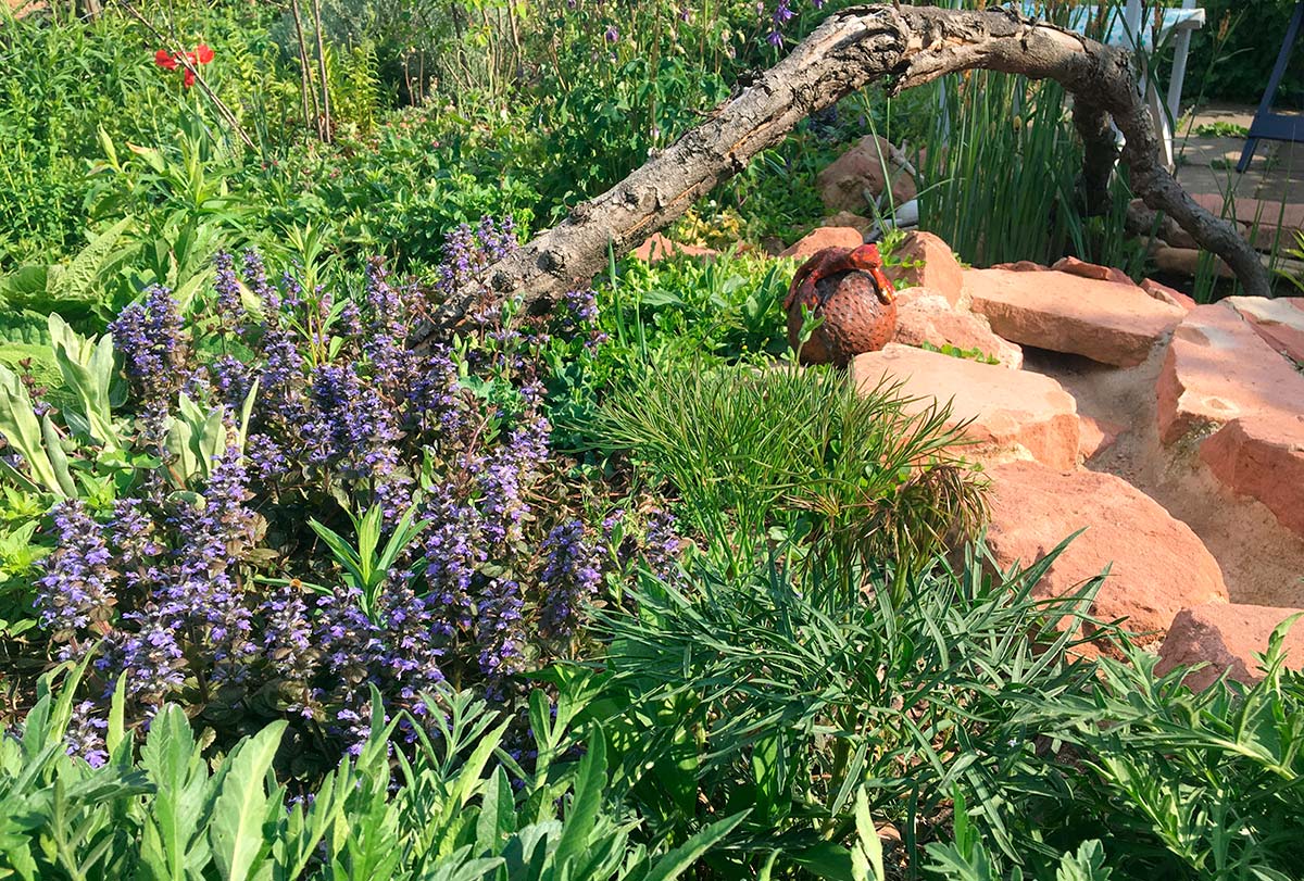 Herrliche Kontraste in Blau: Günsel in oberer Ebene des Biotops verpaart mit bald blühenden Pfingstrosen. Hügel abwärts verbindet sich in Blau- und Rosatönen changierendes Lungenkraut mit den Schachblumen.