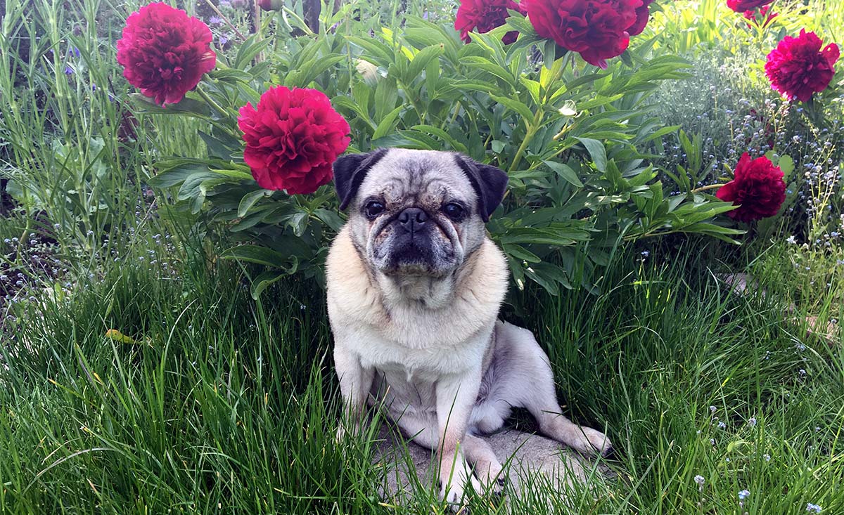 Stress im Garten? Immer mal hinsetzen, beobachten und warten, wer da noch zuwandert. Mops Otto genießt duftende sonnige Plätze ebenso wie seine Menschen.