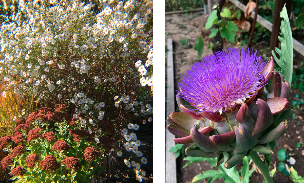Noch einmal möchte ich also das Hohelied auf die Astern anheben. Besonders auf die zart hellblaue Aster Little Carlow und auf die unschlagbare Meistern der Hintergrundfarbe Aster laterifolius. Auch wenn diese Sorte mit Tausenden reinweißen Blütensternchen nach der Farbenlehre nicht als farbig gilt, muss man sich der Funken versprühenden Dame einfach hingeben. Die Honigbienen tun es in ganzen Trauben, die sie besonders in der weißen Aster bilden, während die Hummeln völlig vernarrt die blauen und rottonigen Sorten abweiden. Sie alle nutzen die Herbstastern als willkommene Spättracht. Schmetterlingsarten wie das Tagpfauenauge und der Kleine Fuchs legen sich in ihnen für die Überwinterung ein Fettdepot an, andere wie der Admiral und der Distelfalter stärken sich für ihren herbstlichen Flug in den Süden. Und uns verlängern sie die Gartenlust um einen ganzen Monat. Wie auch die Artischocke meine Erscheinung des Jahres ist.