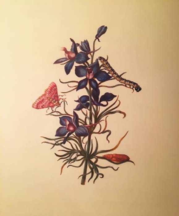 Feldrittersporn und Rittersporneule. Vorlage für Tafel 40 des ersten „Raupenbuchs“ 1679. In dieser feinsinnigen Abbildung ist nicht die Platzierung des Insektes und seiner Wandlung von Gewicht, sondern die Nährpflanze.