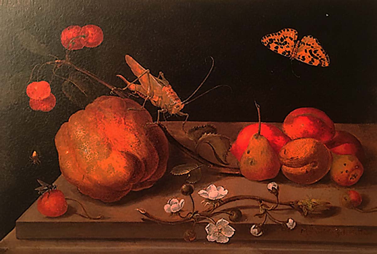 In dieser wundersamen Allegorie vereint sich das Motiv des Erntedanks mit minutiöser künstlerischer Naturstudie. Nicht die Früchte stehen wirklich im Vordergrund der Darstellung. Es ist der Schmetterling und es ist das Insekt, das sich auf der Frucht abgesetzt hat, es sind die naturalistisch wohlgesetzten Einstiche der Fruchtfliegen im Obst. Aus heutiger wissenschaftlicher Sicht und in Anbetracht der fortgeschrittenen Naturzerstörung kann dieses aus der Dunkelheit heraufglühende Aquarell der Insektenforscherin Maria Sibylla Merian durchaus als ökologische Sichtweise verstanden werden. Ihr ganzes Leben hatte sie der Erforschung der Kleinen Lebewesen, vornehmlich der Raupen und Schmetterlinge gewidmet. Ihr Oevre in den langen Abenden des Winters zu studieren, wird mir zur sinnlichen Auszeit vom Stress der Welt und lässt staunen.