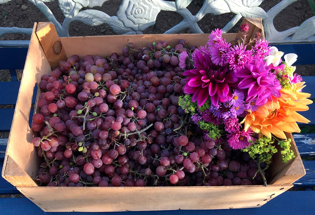 Erntedank mit Farben, die nur der Herbst schenkt. Wein und Dahliensträußchen mit Astern, Duftwicken und Frauenmantel.