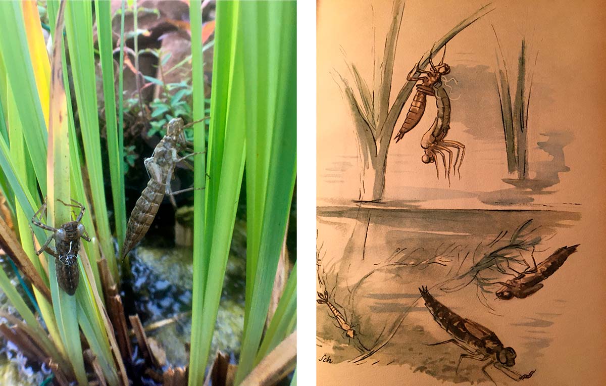 Ein extraterrestrisch anmutendes Wesen am Schilfhalm des Bioteichs und liebevolle Abbildung von